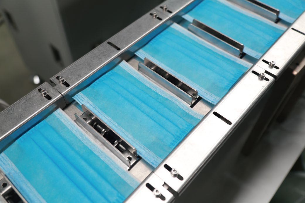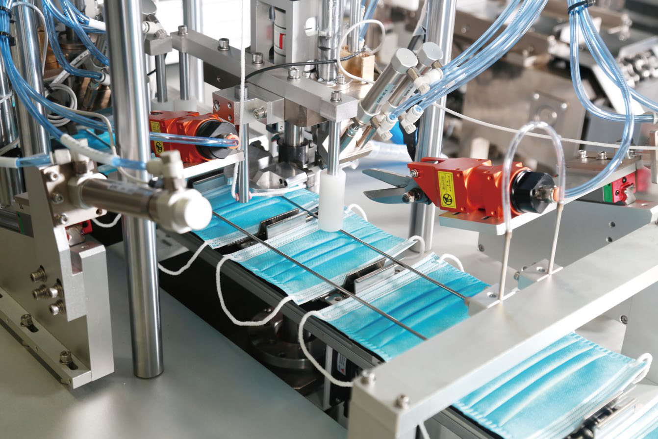2. 生产线采用“一拖二”的结构,一台口罩主体通过传送系统,自动输送分流到两套耳带自动焊接加工工位。