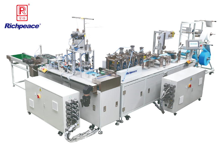 1.生产线采用“ 一拖一 ”的结构,自动送料、剪切鼻夹并完成口罩打片后, 自动传送到耳带工位焊接耳带,并自动码垛。