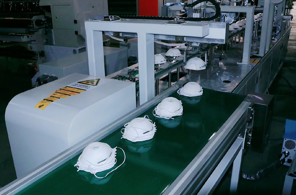 2、必一体育全自动罩杯口罩生产线实现了罩杯口罩从卷料到成品的整个流程。该生产线主要由以下工位组成:料架、上杯体成型、杯体成型、转序、移印、鼻梁条焊接、头带焊接、呼吸阀打孔超声波焊接、口罩拾取。每台机器根据客户需求选择进行设计安装。