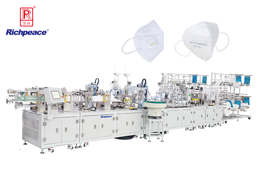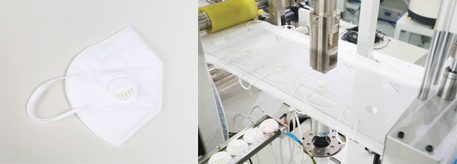 1.全自动化生产N95/KN95带呼吸阀式折叠口罩, 从面料输入到成品输出,自动完成鼻梁夹置入、花辊焊接、标识喷印、耳带焊接、呼吸阀孔冲压与安装、轮廓切割与废料分离等,成品外型尺寸标准,成品率高。
